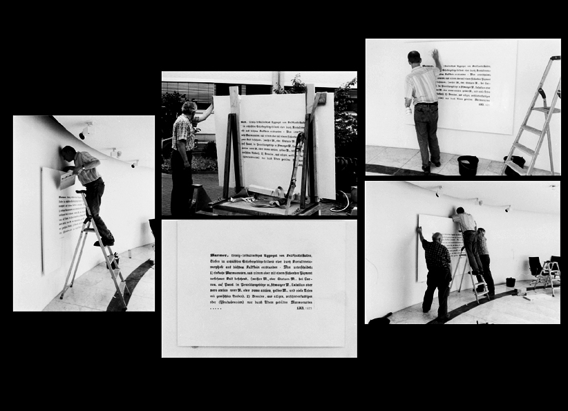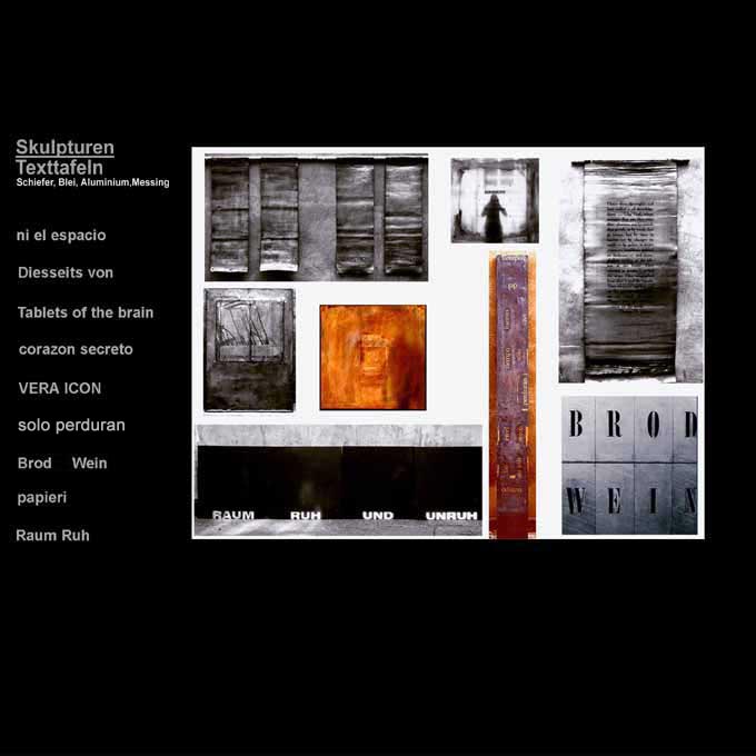 The photos show a sequence of art works which form part of my artistic exploration over the years. Reading and rereading poetry is part of a liflong ocupation and also part of my artwork Borges, Thomas de Quincey, Hölderlin, San Juan de la Cruz, Cervantes, Lessing, Ernst Meister, the Psalms ... Texts of those poets are depicted on plates of slate, marbel, aluminum, led, brass.