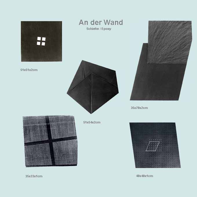 Central to my sculptural work is a series of objects of slate, a material of strong tactile quality with a richness of visual qualities as well. The surface of slate may appear as a deap soft darkness or as a matt grey of the natural stone. Slate may be scratched, drilled, sawn, polished as well as combined with other materials. In my work I discovered the qualities of lead and colored epoxy in combination with slate as potential and potent artistic solution. These works are objects to be placed at the wall. They have been produced mainly between 1982 and 1999.